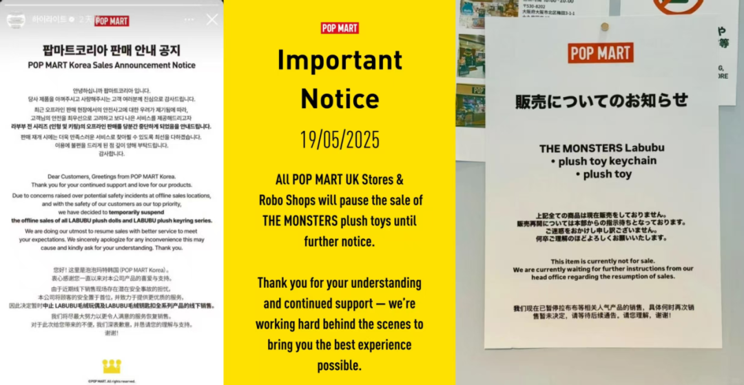 基于黄牛在潮玩市场一直以来的普遍性,泡泡玛特在黄牛问题的应对上是相对快的。5月,泡泡玛特先后宣布英国、法国、日本、韩国等多国线下店停售LABUBU系列产品,其主要目的是应对愈演愈烈的线下黄牛抢购。过去两三个月时间里,泡泡玛特海外店曾多次因为夜排、消费者肢体冲突等问题成为舆论中心。